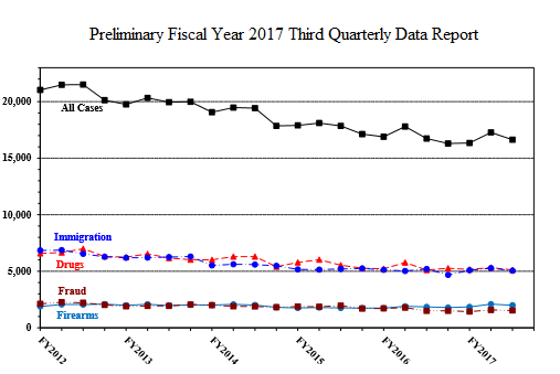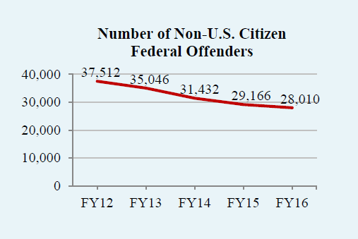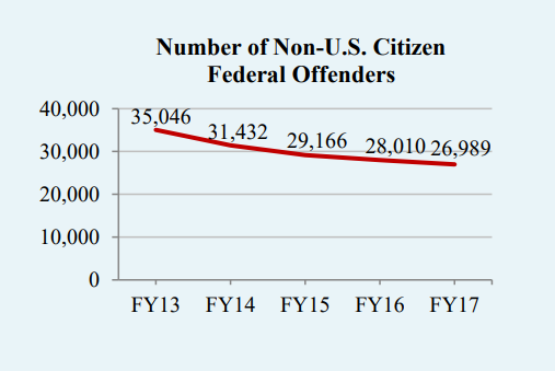 (June 2018) Non-U.S. citizen offenders accounted for 40.7% of all federal offenders sentenced in FY 2017. The number of non-citizens sentenced has decreased over the last five years.