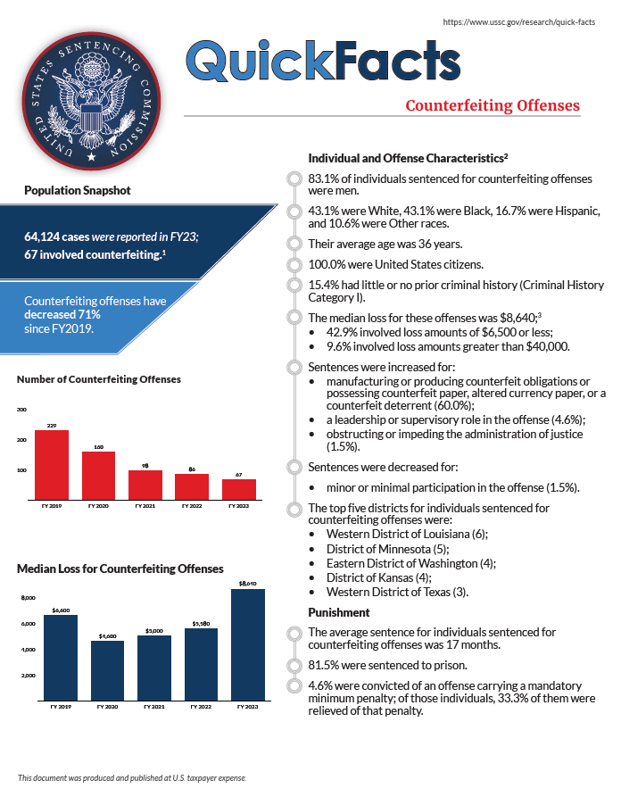 - 76.7% of individuals sentenced for counterfeiting offenses were men.