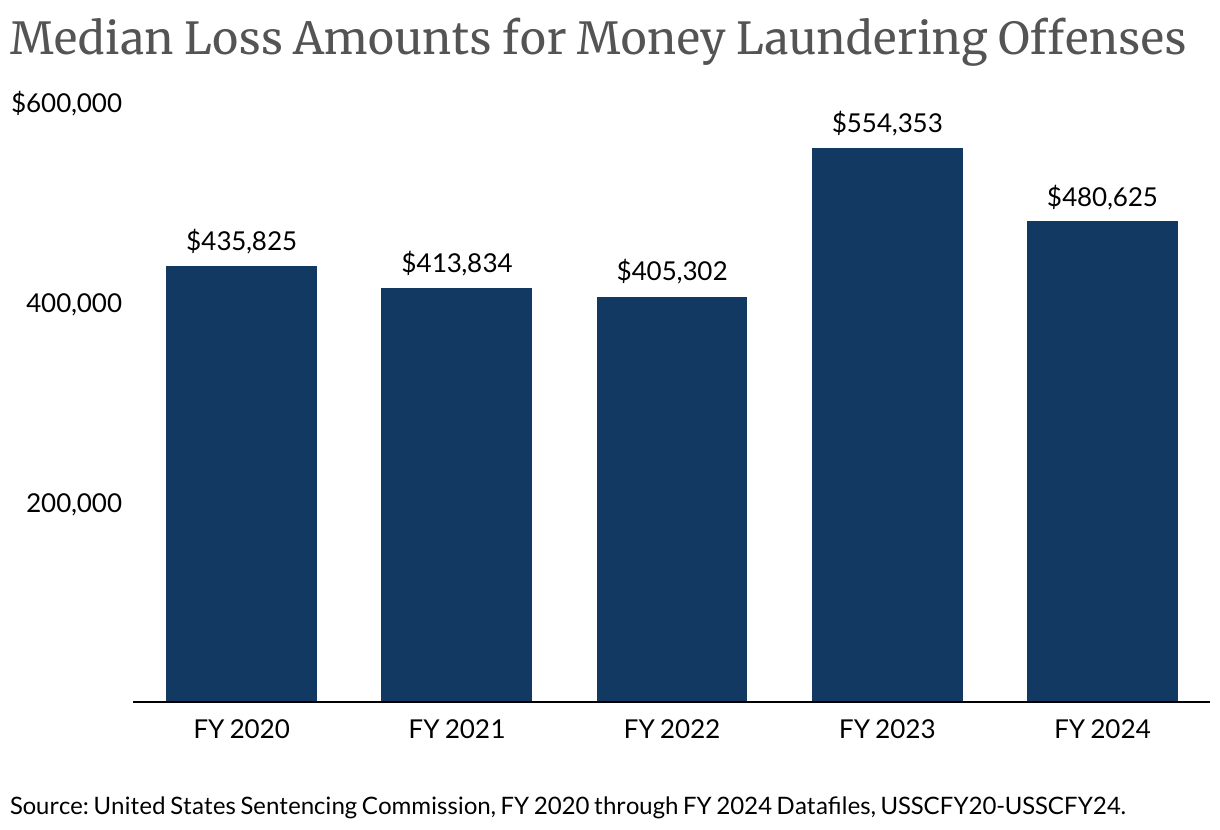 - The average sentence length for individuals sentenced for money laundering offenses was 62 months.