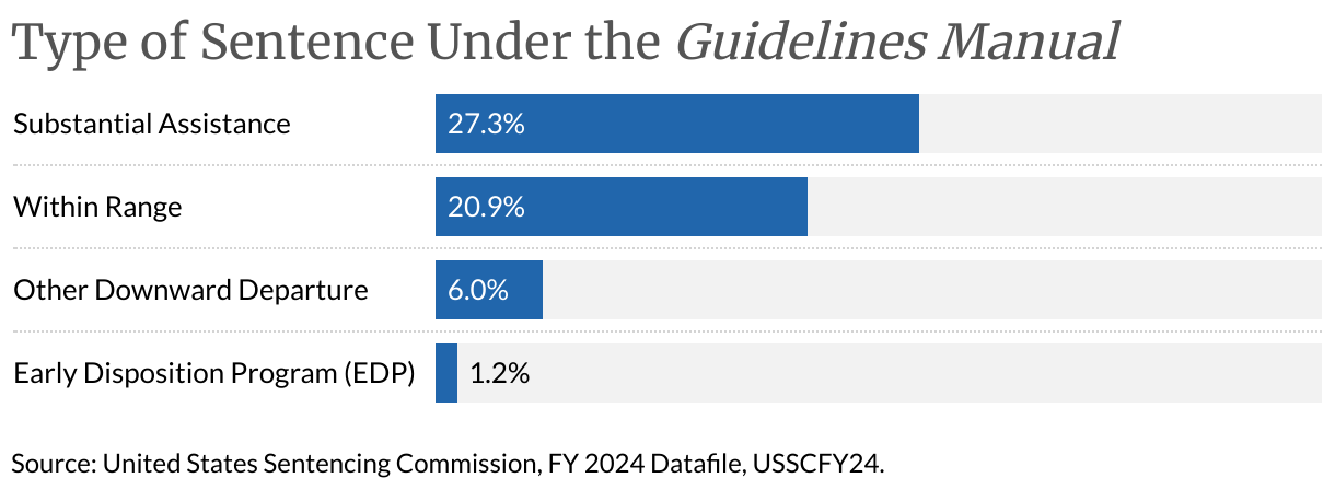 - 25.6% were convicted of an offense carrying a mandatory minimum penalty; 54.4% of those individuals were relieved of that penalty.