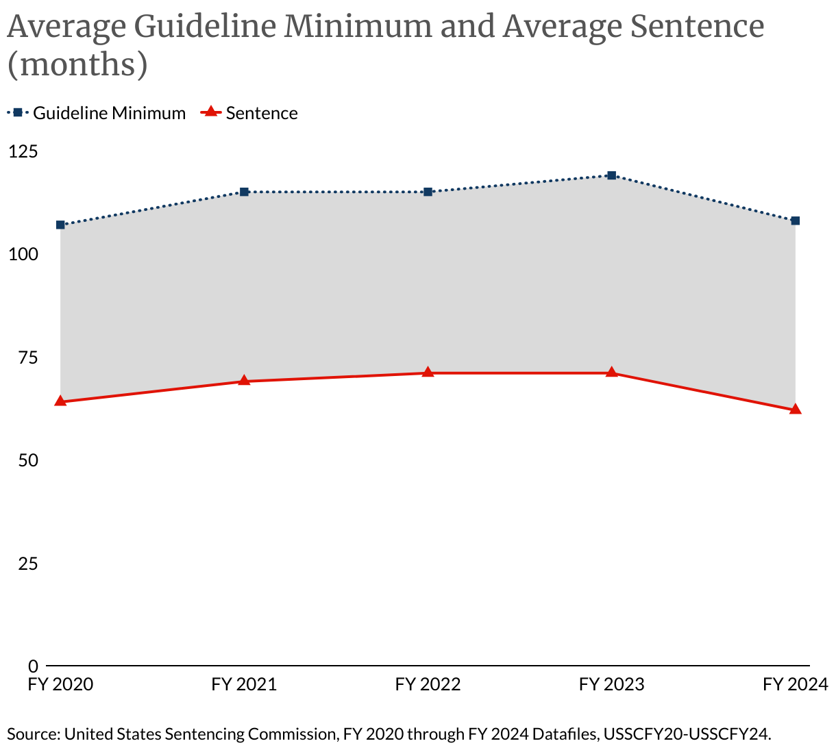 - The average guideline minimum increased and decreased throughout the fiscal years. The average guideline minimum was 107 months in fiscal year 2020 and 108 months in fiscal year 2024.