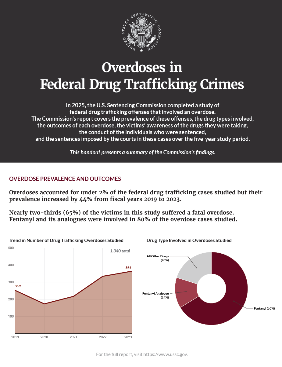 In 2025, the U.S. Sentencing Commission completed a study of federal drug trafficking offenses that involved an overdose. The Commission’s research report Overdoses in Federal Drug Trafficking Crimes (published March 6, 2025) covers the prevalence of these offenses, the drug types involved, the outcomes of each overdose, the victims’ awareness of the drugs they were taking, the conduct of the individuals who were sentenced, and the sentences imposed by the courts in these cases over the five-year study period.